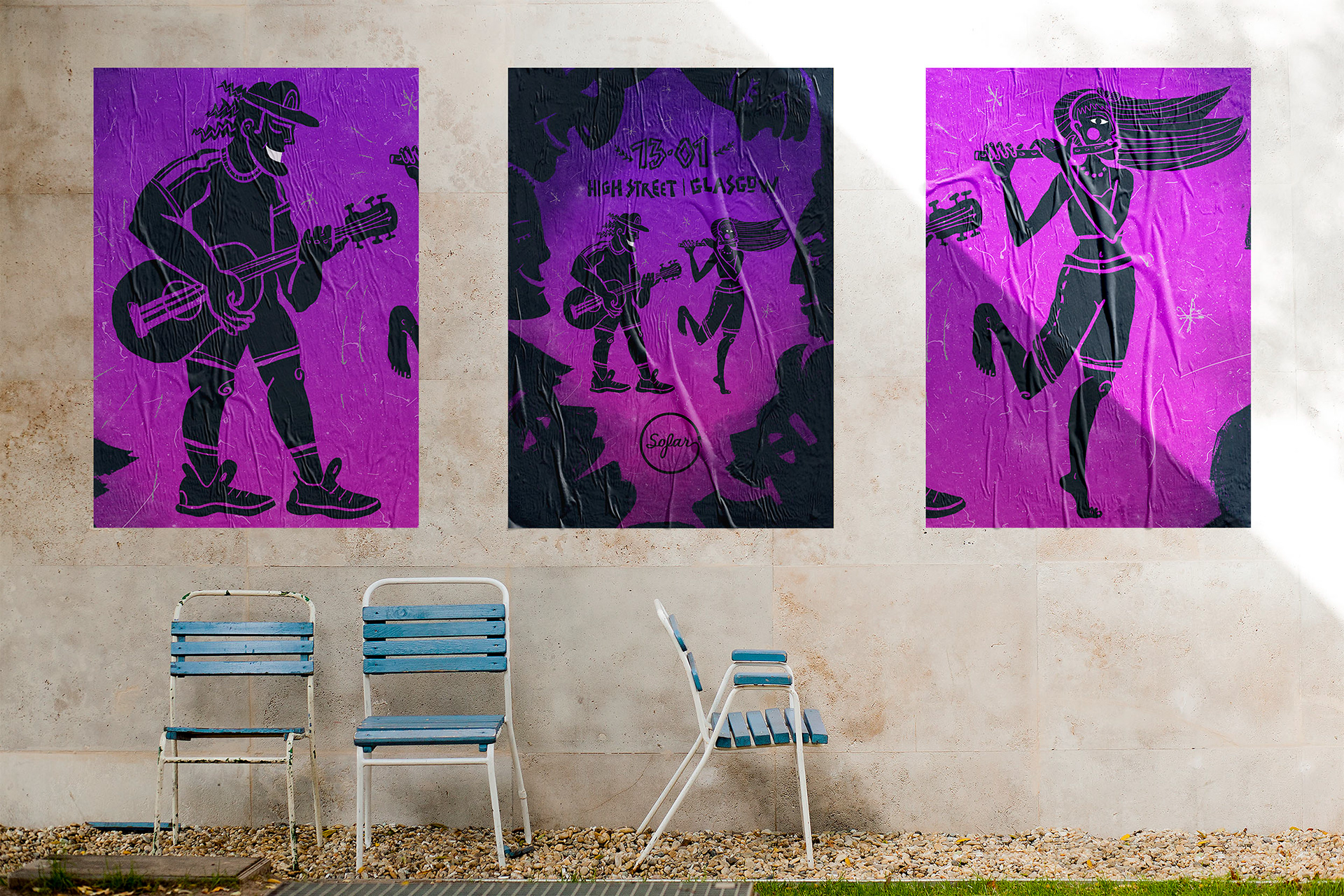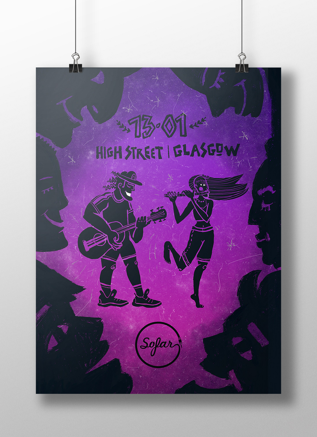 This playful, illustrative poster is designed for the world wide known organisation Sofar Sound's gig in Glasgow, Scotland.